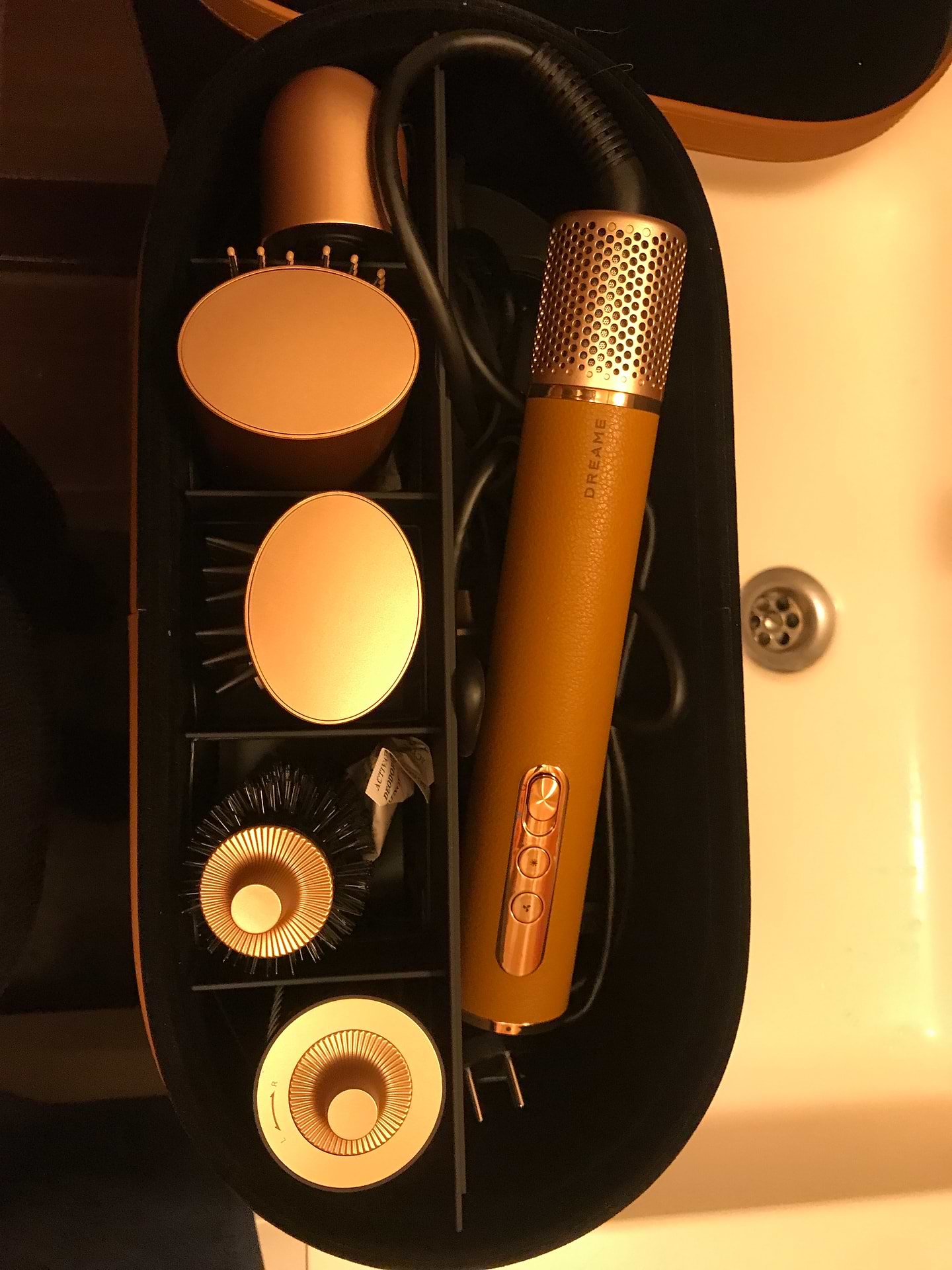Чудова знахідка для тих, хто ще не опанував укладання на браш або має пористе волосся. Прикореневий об’єм легко створюється за допомогою насадки-брашу. Стайлер має дуже приємний карамельно-золотий дизайн та якісний кейс для зберігання.