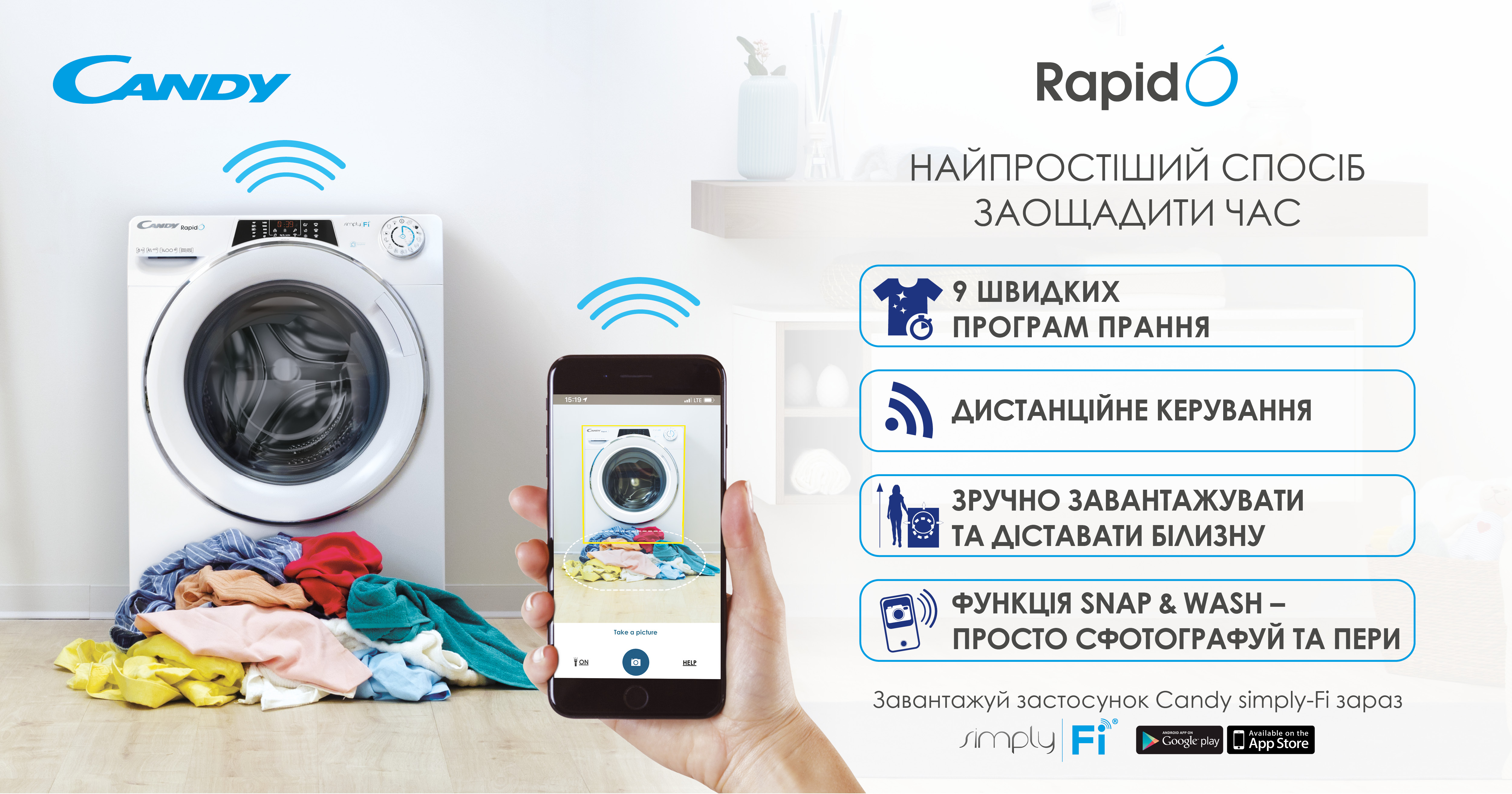 Пральну машину RapidÓ оснащено вбудованим модулем Wi-Fi для поліпшення вашого досвіду взаємодії з машиною. Поради щодо прання завжди під рукою. За допомогою застосунку Candy simply-Fi ви можете спілкуватись з RapidÓ та отримувати відповіді щодо ефективного прання, видалення плям і багато чого іншого.