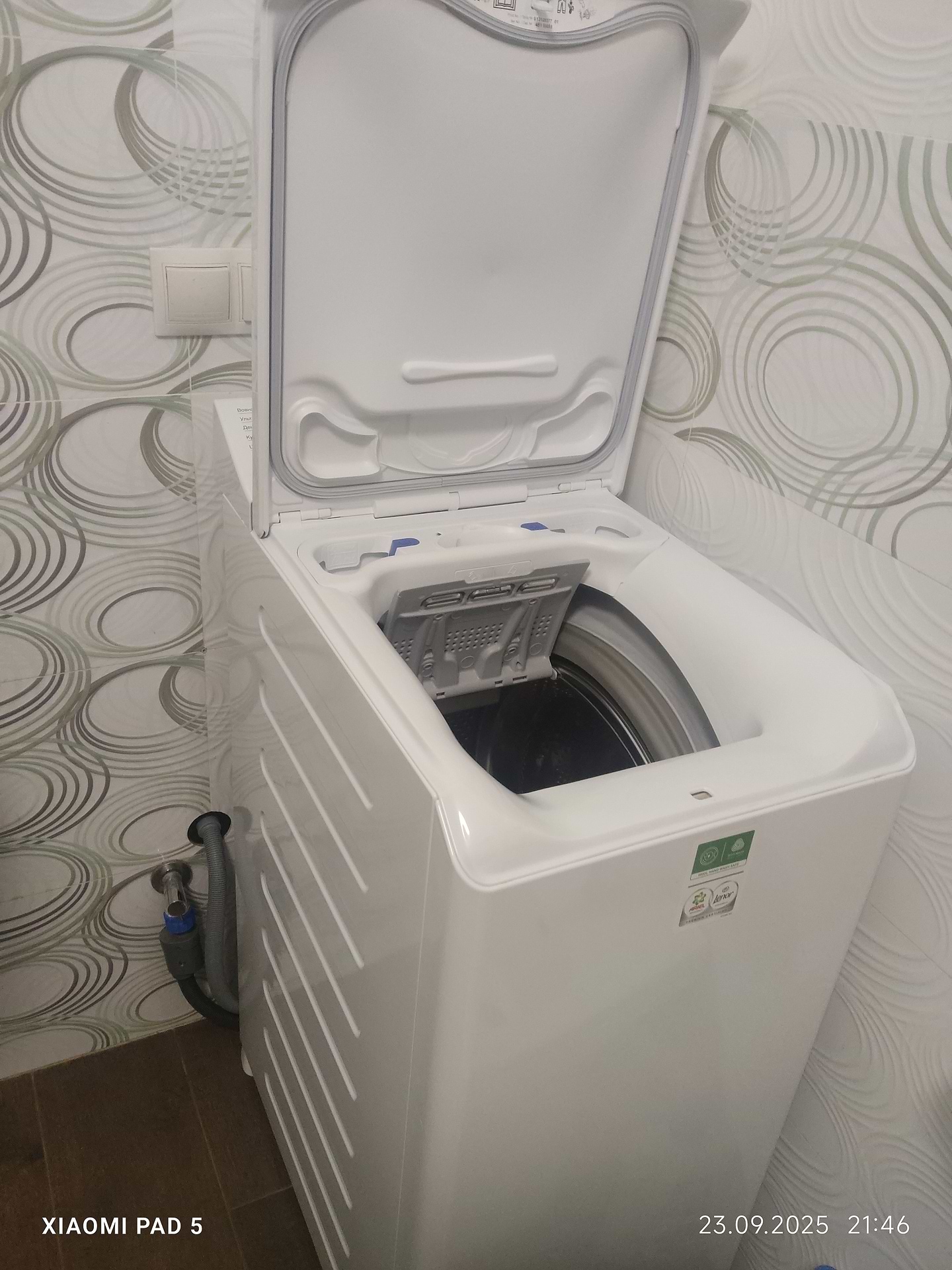 меню українською, тихо працює, подає сигнал коли вмикається і по закінченню прання, місткий барабан, вертикальне завантаження речей для прання дає можливість довантажувати речі після початку прання, сама повністю вимикається по закінченню прання, має короткий цикл прання тривалістю 14 хвилин, окрім цього функції для прання деніму, вовни, бавовни, синтетики, очистка паром кашеміру, прання курток, ультрапрання, прання пуховиків та тонких тканин