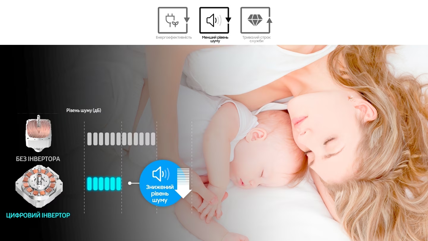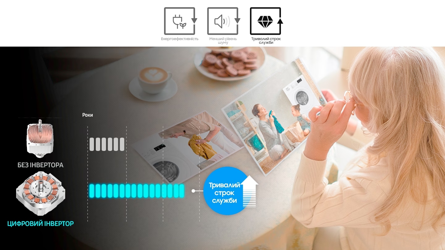 Модель обладнана двигуном Digital Inverter. Його конструкція відрізняється від колекторних, які застосовують в інших типах побутової техніки, відсутністю деталей, що труться: ременів і вугільних щіток. Агрегат оснащений інвертором, у якому відбувається подвійне перетворення напруги та зміна її форми і частоти. Конструкція забезпечує такі переваги: