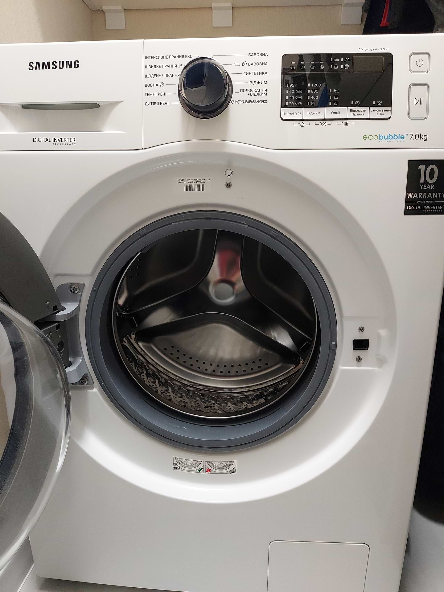 Самсунг і цим все сказано! Розмір компактний і при тому ,що на 7 кг. Клас! Всі необхідні програми є, працює тихо, не скаче при віджиманні, приємна мелодія в кінці прання. Рекомендую!