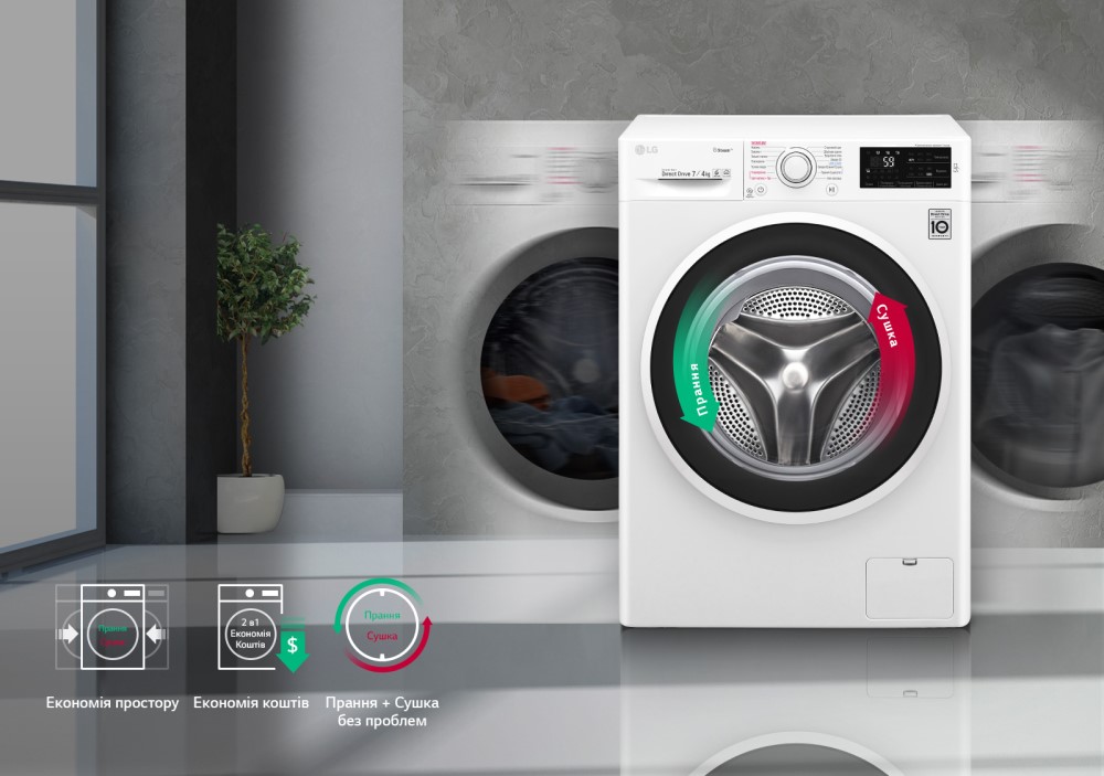 Пральна машина LG із вбудованою сушкою LG - два прилади в одному. Після того, як програма прання завершиться, речі почнуть сушитись в барабані, їх навіть не потрібно виймати чи переставляти. Економте Ваш час та простір Вашого приміщення.