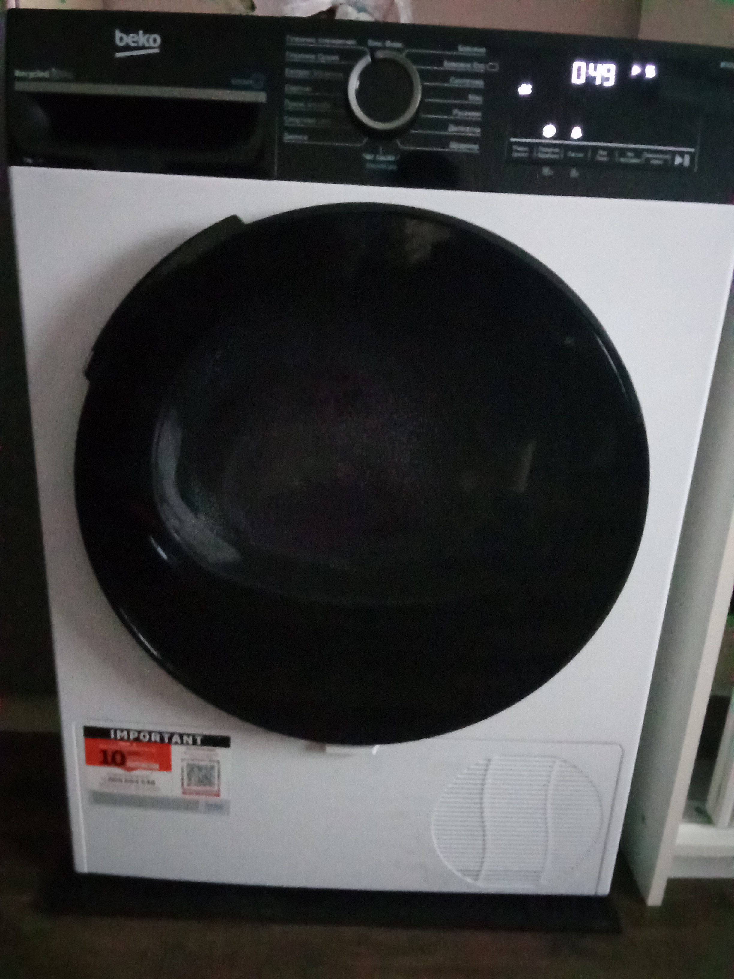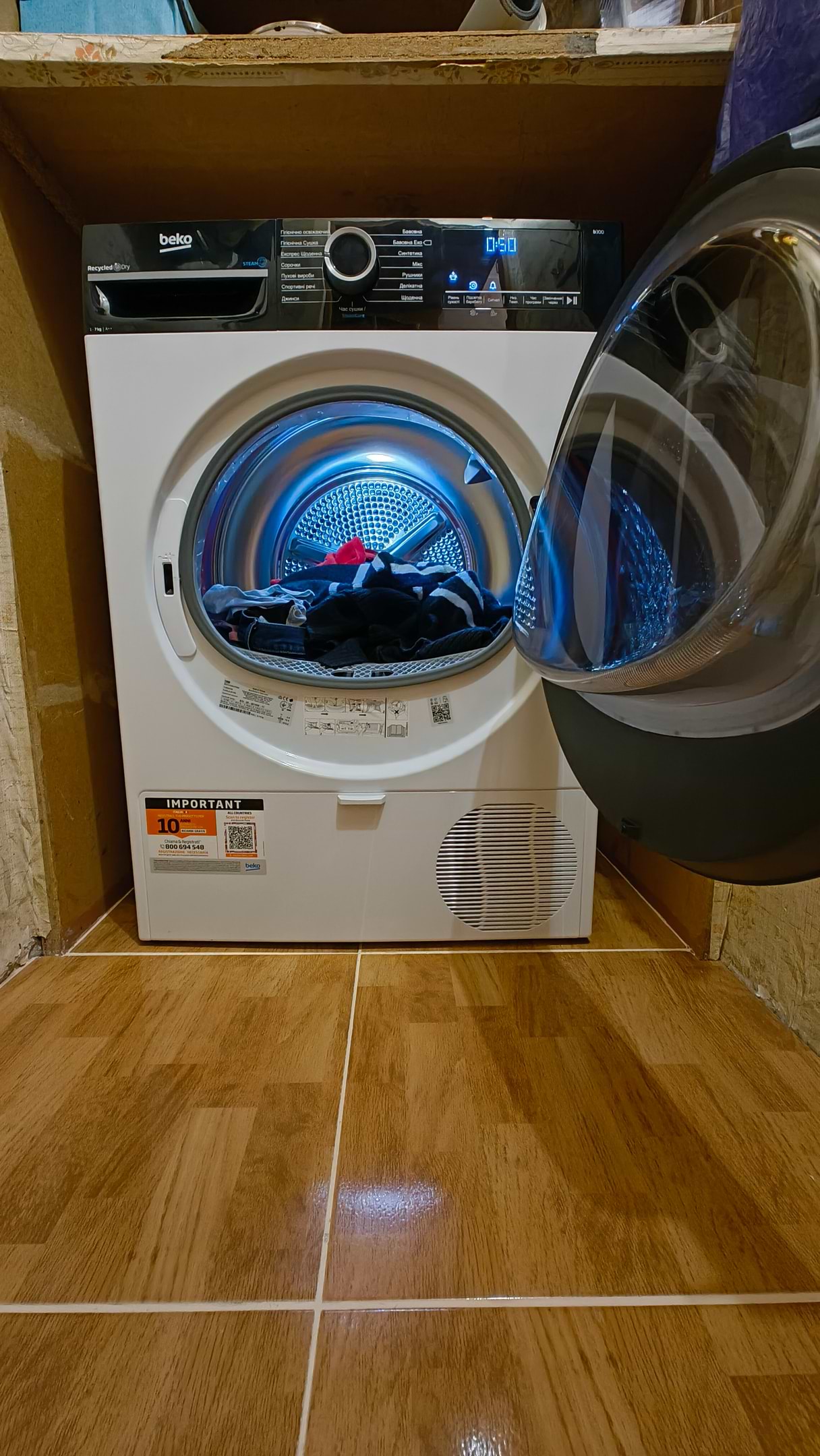 Чому вибрав саме цю Beko, бо вона вузька і в неї є технологія теплового насосу heat pump, дуже економить електроенергію. А ще вона гарна? з підсвічуванням барабану, речі сушить швидко і вони залишаються м'які.