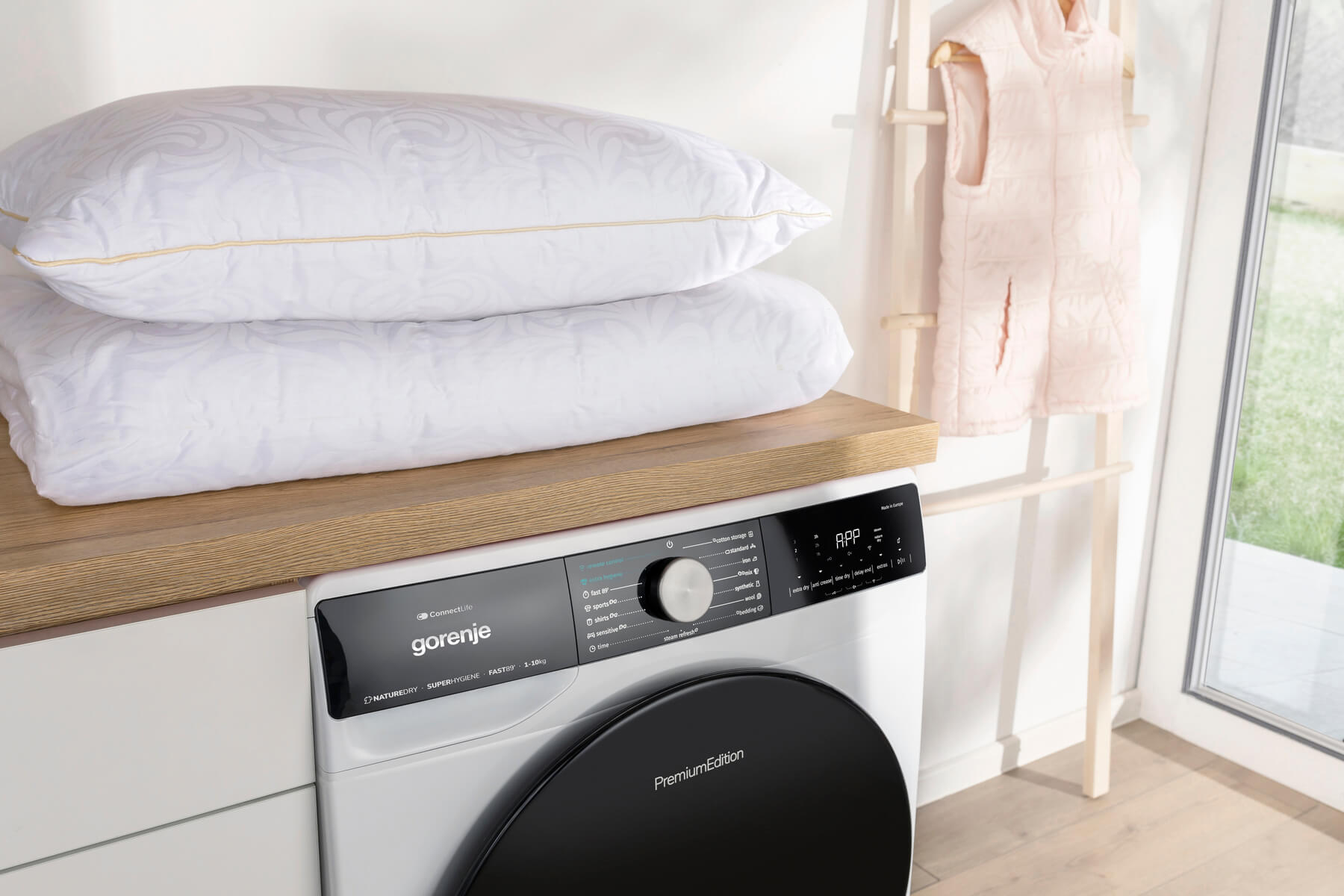 Для пухових ковдр, верхнього одягу та пухових подушок в сушильній машині є спеціальна програма.