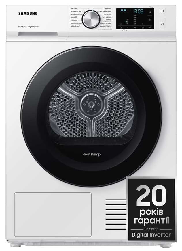 Сушильна машина від Samsung дуже виручає — сушить білизну швидко й рівномірно, 9 кг завантаження цілком вистачає для сім’ї. Використовує тепловий насос, тож споживає значно менше електроенергії, ніж старі моделі. Одяг після сушіння м’який, без запаху вологи, і часто не треба прасувати. Режимів багато: від швидкої сушки до делікатної, за потреби можна підлаштувати під тип тканини. Якщо живеш у квартирі і сушити на балконі важко — чудово спрощує побут.