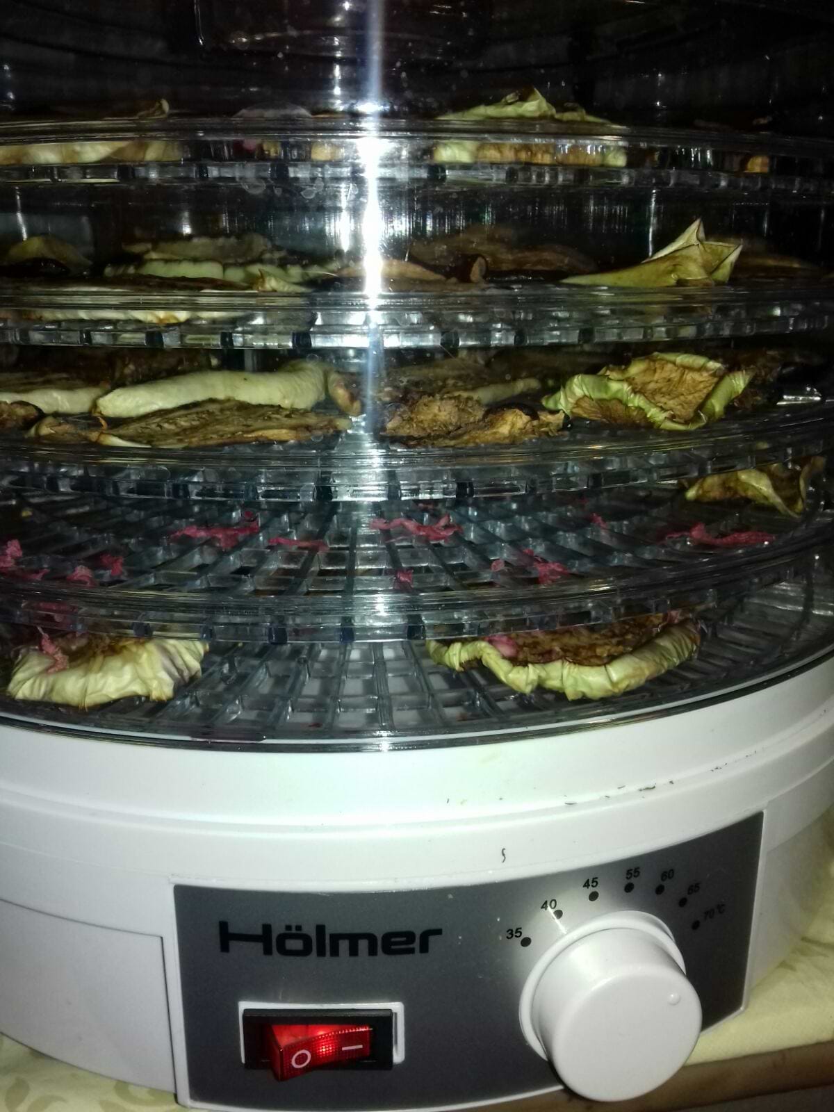 Давно хотела сушилку для овощей и фруктов, выбрала для начала недорогую, очень довольна покупкой, смотрела чтобы была защита от перегрева и регулировалось температура. работает отлично, поддоны большие, пластмасса не воняет