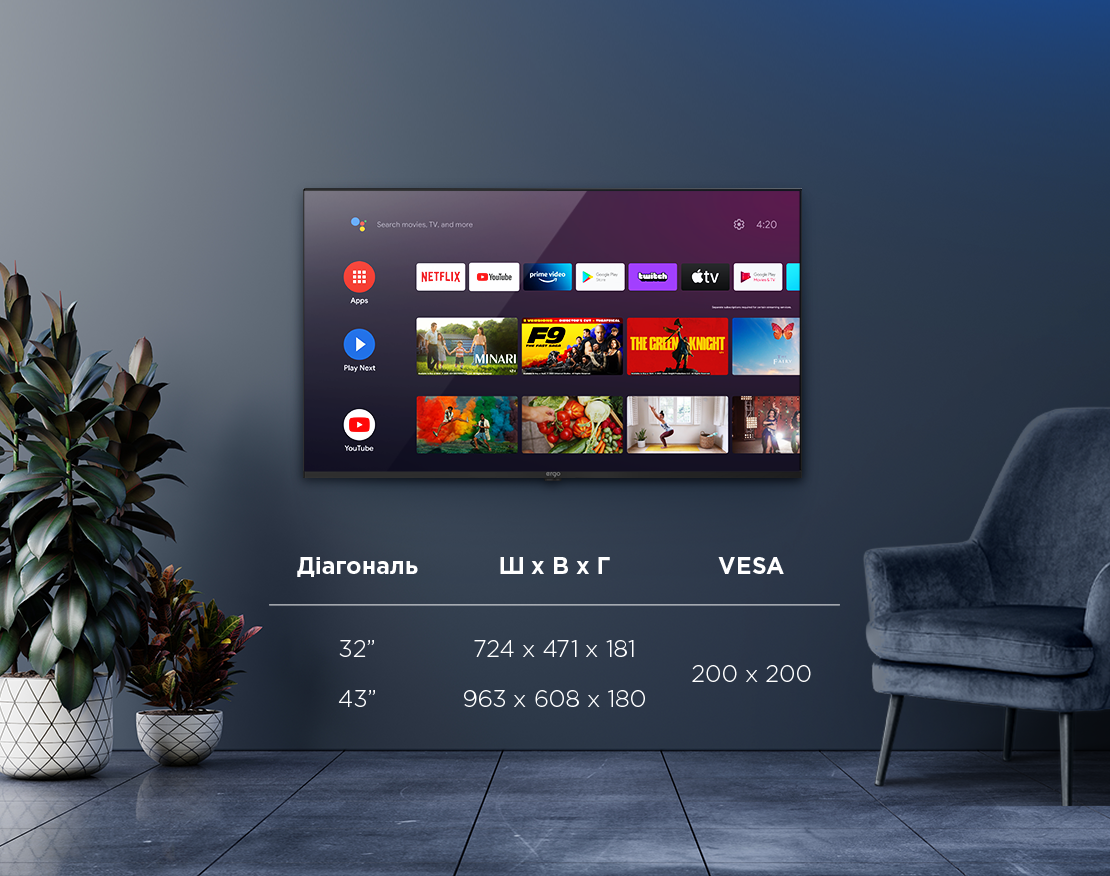 Офіційна та найпопулярніша операційна система в світі від Google вже у вашому телевізорі ERGO. Безмежні можливості з перегляду світових стрімінгових сервісів, найновіші прем'єри, музика, ігри та мандрівки в інтернеті на кнопці вашого пульта