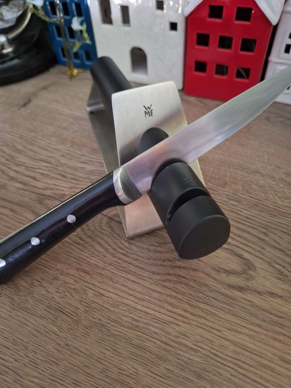 Точило для ножів WMF використовую вже кілька місяців. Абразив не стирається, керамічний шар працює чудово. Точилка стоїть стійко, не потрібно нічого притримувати руками.