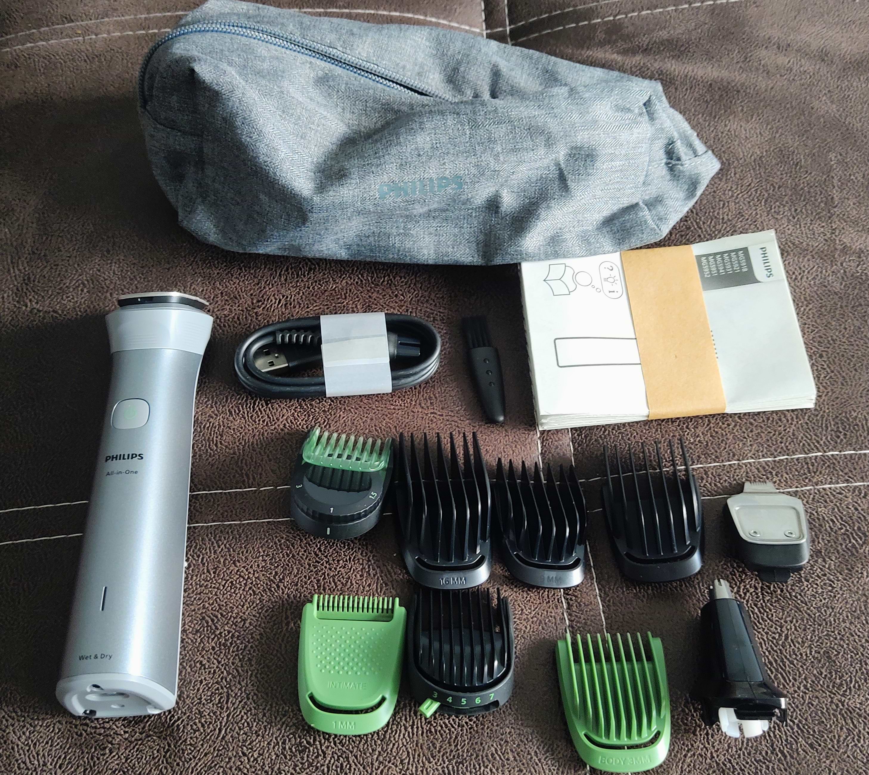 - комплектація: 2 регульовані насадки-гребеня (1-3, 3-7 мм), 3 змінні насадки (9, 12, 16 мм), 1 насадка-гребінь для тіла (3 мм), 1 насадка для інтимних зон (1 мм), насадка для вух і носа, м'як для очищення, USB-;