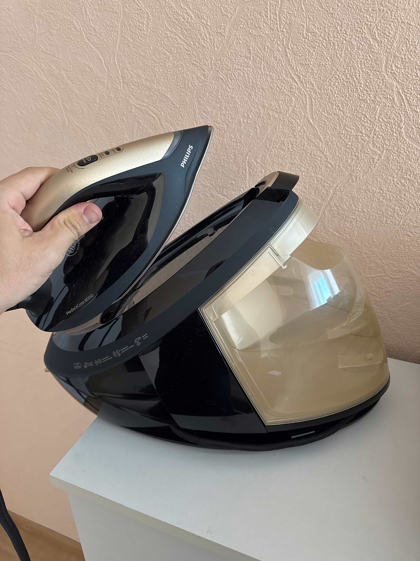 Доброго вечора! Хочу залишити відгук про цю праску с парогенератором.По перше мені дуже подобається дизайн.По друге,швидкий нагрів та звуковий сигнал(чути навіть у сусідній кімнаті).Сама праска не важка,та навіть після двох,трьох годин прасування рука не болить).До підошви праски нічого не пристає,що дуже приємно.Швидко та дуже зручно.Покупкою задоволена.