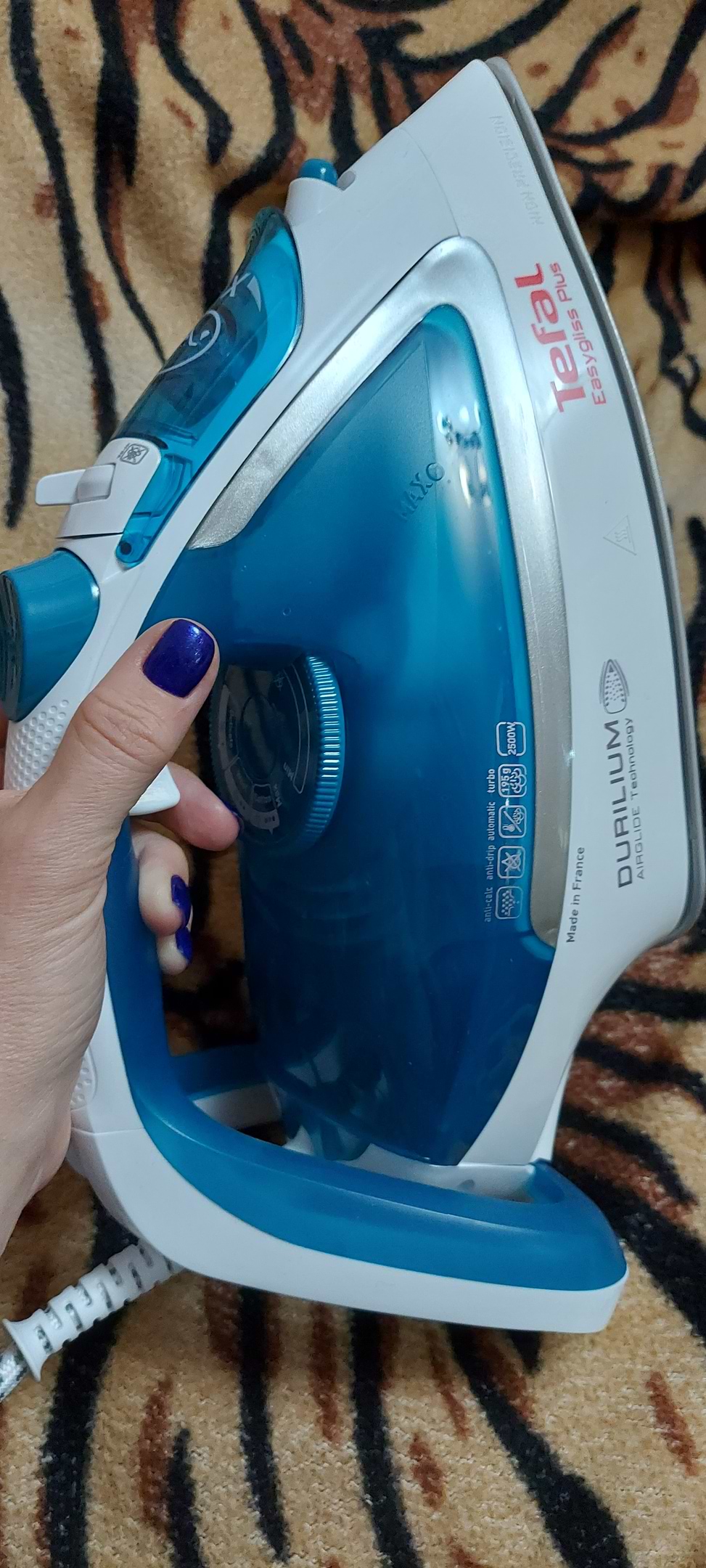 Купила утюг Tefal и очень довольна. Гладит,скользит,отличная подача пара и благодаря этому прекрасно отпаривает. Не протекает. Достаточно длинный шнур. Регулировка при выборе типа ткани. Супер утюг.