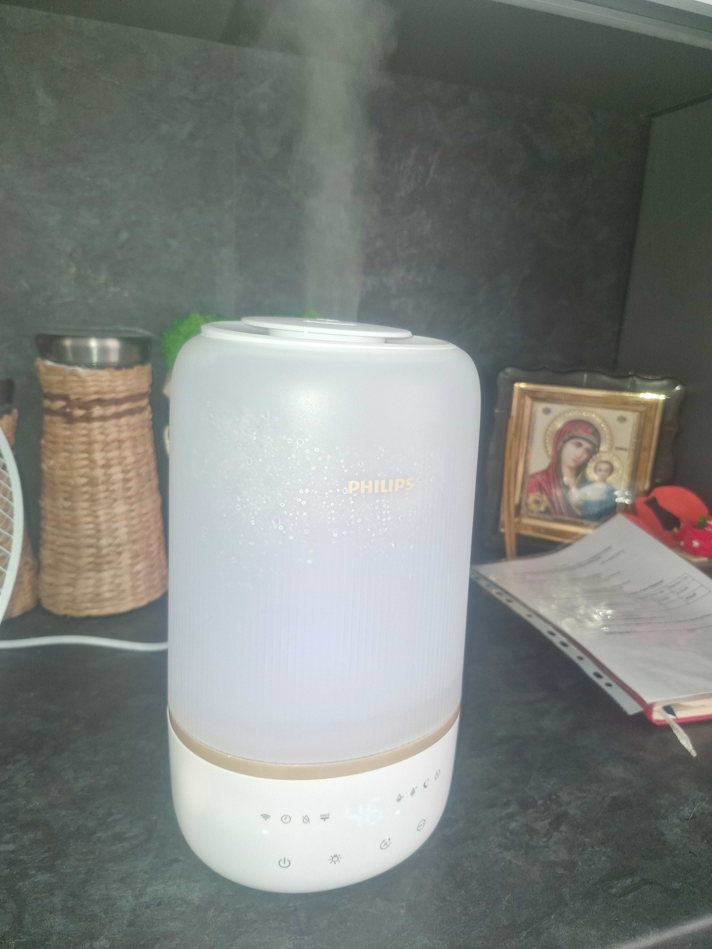 чудово працює, сам собі відчуває коли сухо в кімнаті, вмикається, сигналізує коли треба долити воду, робота тиха настільки, що він не заважає спати абсолютно. красивий дизайн, а головне виконує свою головну функцію без проблем. додаток встановила, вмикаю часто з додатку.