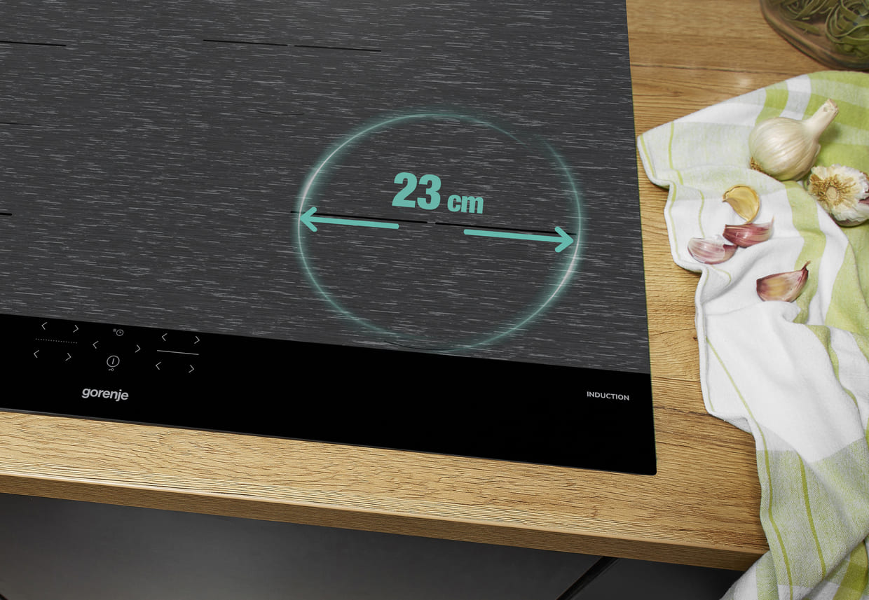 З новою конфоркою діаметром 23 см, розташованою в передній частині панелі, ви легко приготуєте страви у великому посуді - без перегріву або холодних ділянок. Вона ідеально підходить для затребуваного розміру каструль і сковорідок, рівномірно нагріваючи всю площу дна, щоб ви щоразу отримували ідеальний результат. Зручність у кожній деталі – з BigZone від Gorenje.
