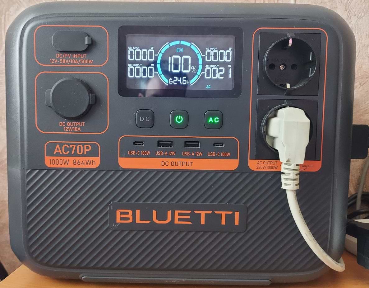 Придбав станцію ще у червні 24 року. Інверторний холодильник Bosh KGN49XW306 (70-90 Вт/год), роутер (12Вт), онушку(5Вт), ноут(40-60 Вт) - все тягне. На 5 годин вистачає. Якщо підключити роутер та онушку через USB, та й ноут заживити через Г-перехідник+кабель Type-C, то споживання цих пристроїв зменшиться майже вдвічі і тоді все разом може пропрацювати до 8 годин. Заряджається за 1,5-2 години, в залежності від налаштування швидкості зарядки. Загалом пристроєм задоволений, працює тихо. Можливо комусь буде важливо - але в додатку до Bluetti можна дивитися стан зарядної станції, керувати нею тільки на відстані +-10 метрів за допомогою Bluetooth. Через інтернет це робити неможливо. На фото показане споживання мого моноблоку, підключеного до роз'єму AC (220V), але без монітору. Це з врахуванням стану зарядної станції, якій вже минув рік.