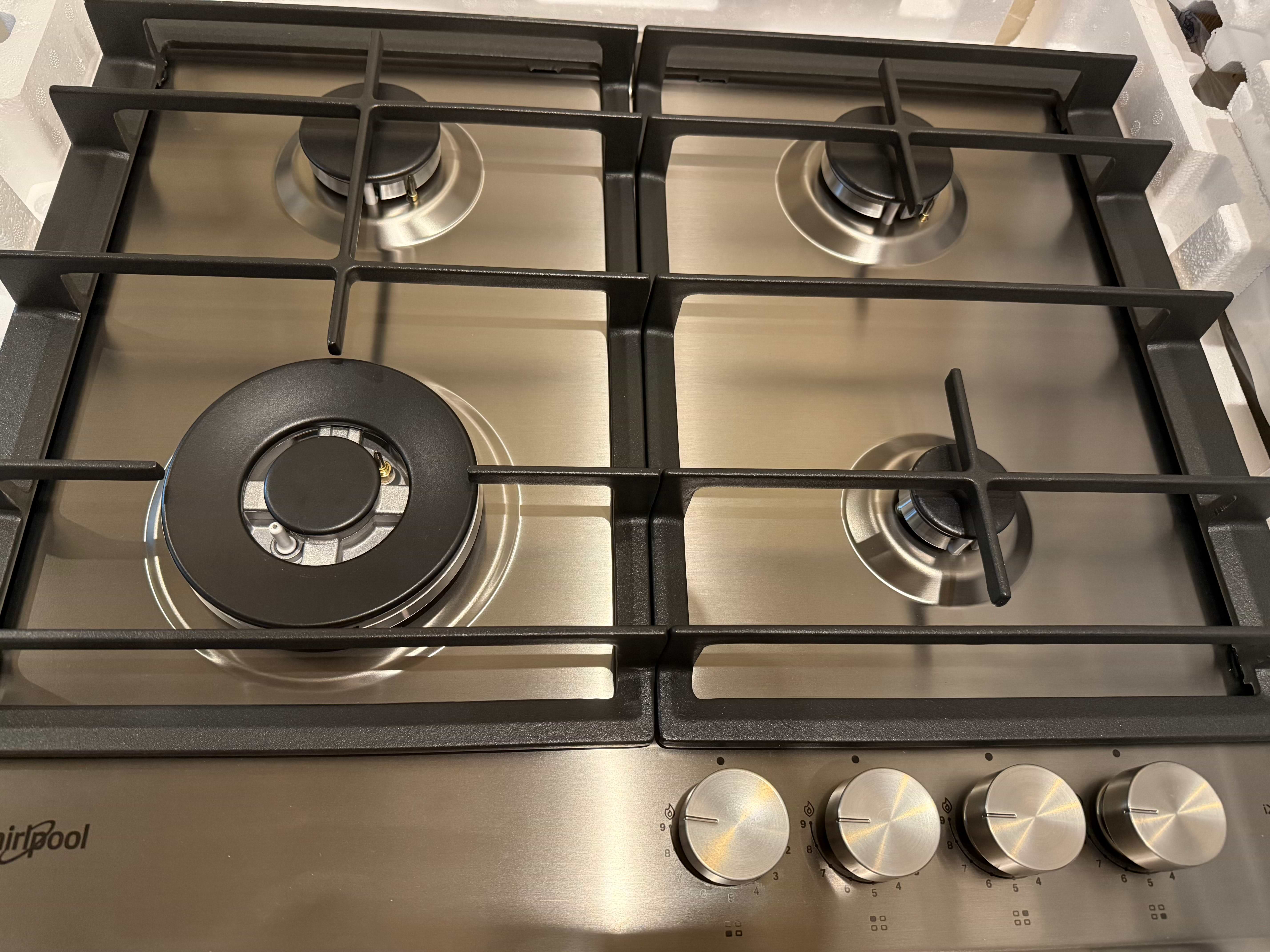 Зручно розташовані конфорки. Решітка на якій є можливість поставити маленьку турку. Гарно вписалася в інтерьер . Дуже задоволена придбаною поверхнь Whirlpool.