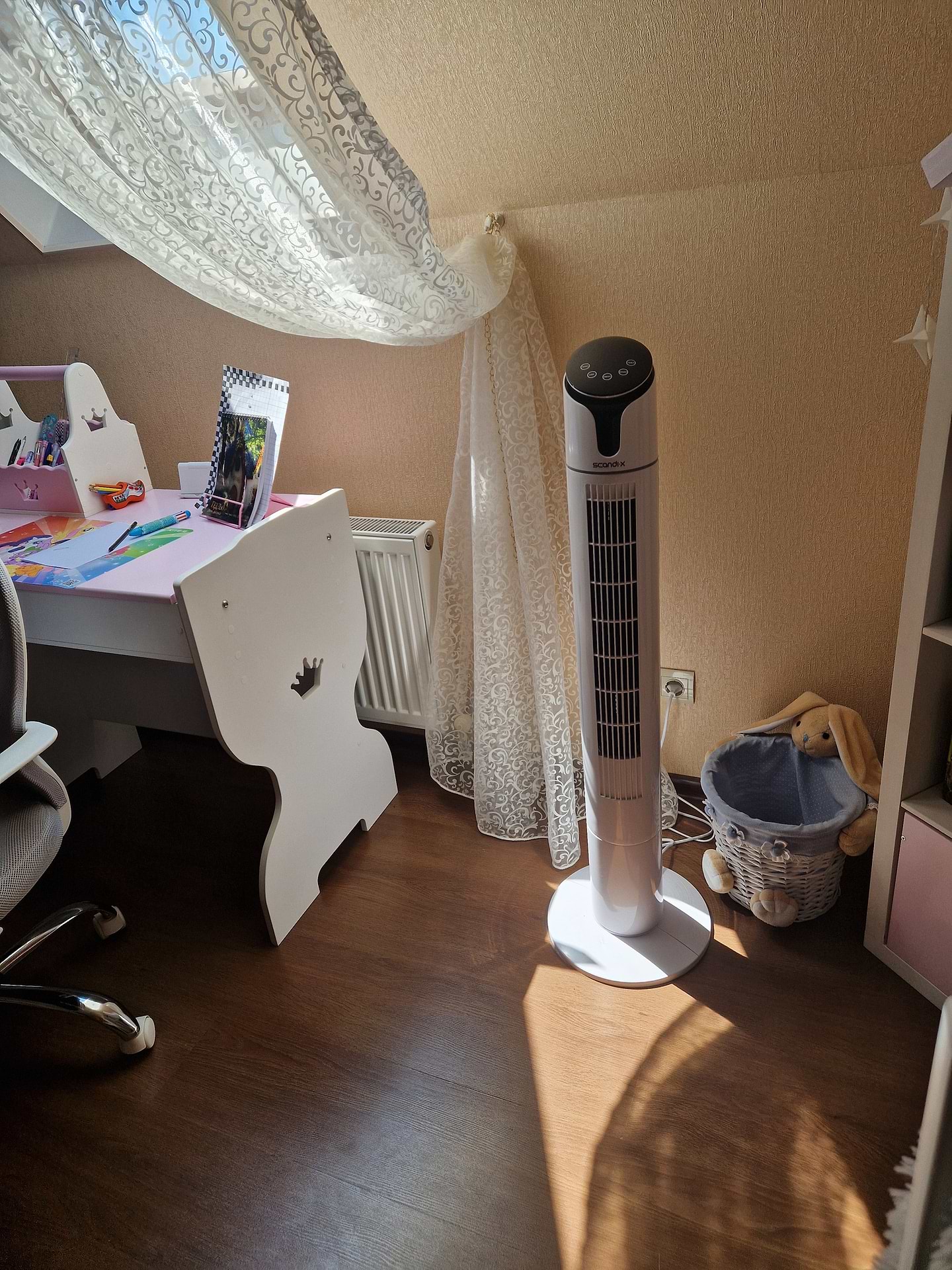 Виглядає стильно і сучасно! В спеку вентилятор добре обдуває людину на відстані до трьох метрів, на більшій відстані струмінь повітря вже не настільки сильний. Працює тихо, спати не заважає!