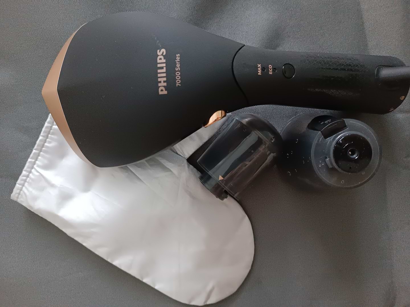 Працює у двох режимах (є режим для делікатних речей), швидко гріється. Комплектується з двома резервуарами для води різню ємністю, рукавичкою для захисту та має чохол для зберігання (також на ньому можна прасувати).