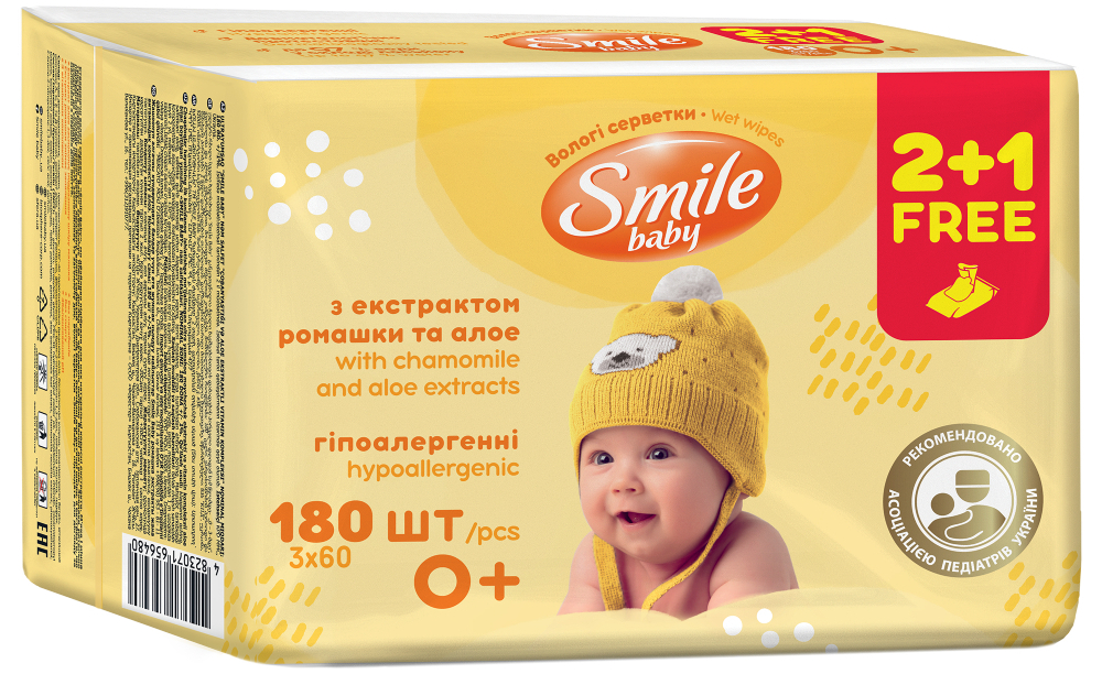 Влажные салфетки для грудничков Smile Baby Мультипак Экстракт ромашки и алоэ 2 + 1, 60 шт. (42113803)