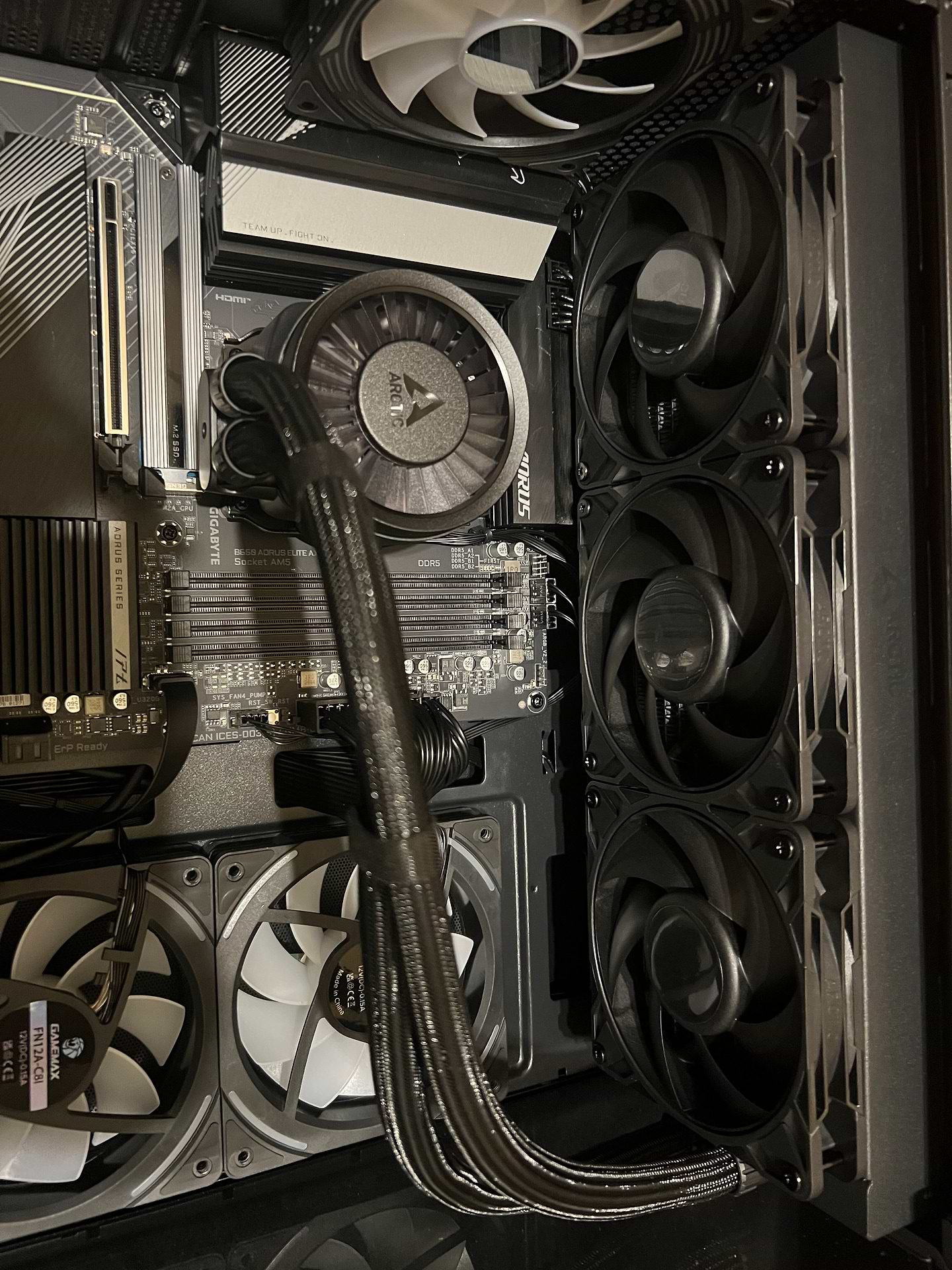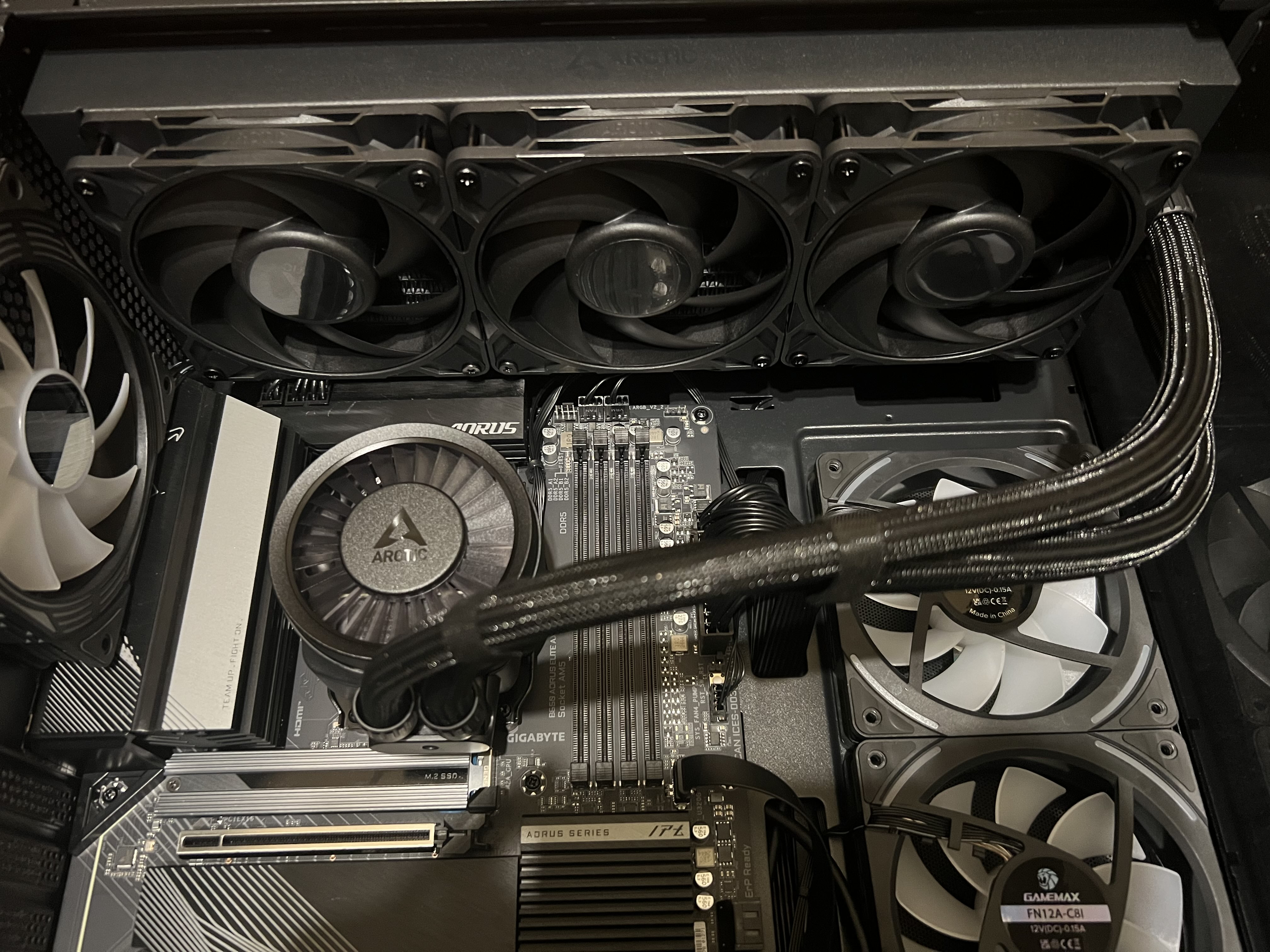 Система ARCTIC Liquid Freezer III Pro 360. Мій потужний процесор винятковим охолодженням, знизивши пікові температури в порівняно з попереднім повітряним кулером, що дозволило мені стабільно підтримувати високий розгін. Особливо вражає її фірмова конструкція блоку помпи, яка не лише ефективно відводить тепло від CPU, але й має спеціальний, більш потужний вентилятор для активного охолодження зони VRM материнської плати, що є критично важливим для стабільності під навантаженням. Завдяки інтелектуальному прокладанню кабелів, при якому усі дроти живлення та приховані в обплетенні трубок, монтаж був неймовірно чистим та акуратним, вимагаючи лише одного підключення до материнської плати. Незважаючи на значну товщину радіатора, його ефективність і тиха робота навіть при високих обертах роблять цю СВО ідеальним вибором для збірок класу High-End, де потрібна максимальна продуктивність і мінімальний акустичний дискомфорт.