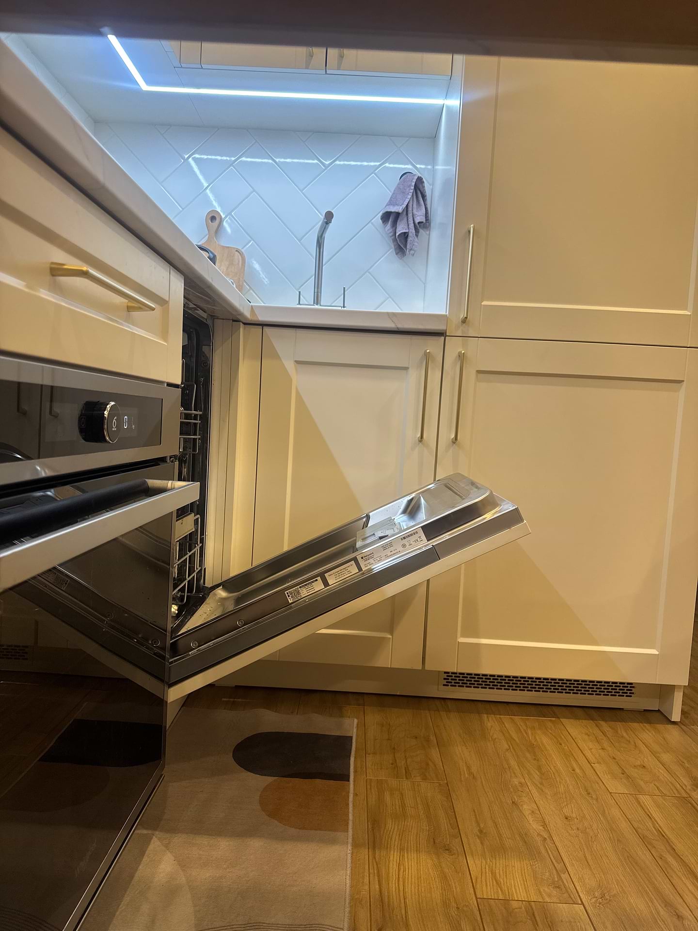 По-третє, попросила за додаткову плату (про яку я свідомо знала, хіба що не знала ціни)) встановити фурнітуру (меблеву дверку). Якби я знала як цей ломастер встановить її, я б в житті не попросила його це робити. Після його встановлення дверка посудомийної машинки не відкривається на 90 градусів, як повинна! Тобто я взагалі не можу витягнути нижній відсік та засипати сіль! Також помітила, що цей майстер встановив фурнітуру не щільно до дверки посудомийки, елементарно - замість чотирьох шурупів, було встановлено 2, що також не давало можливості відкрити дверку повністю.