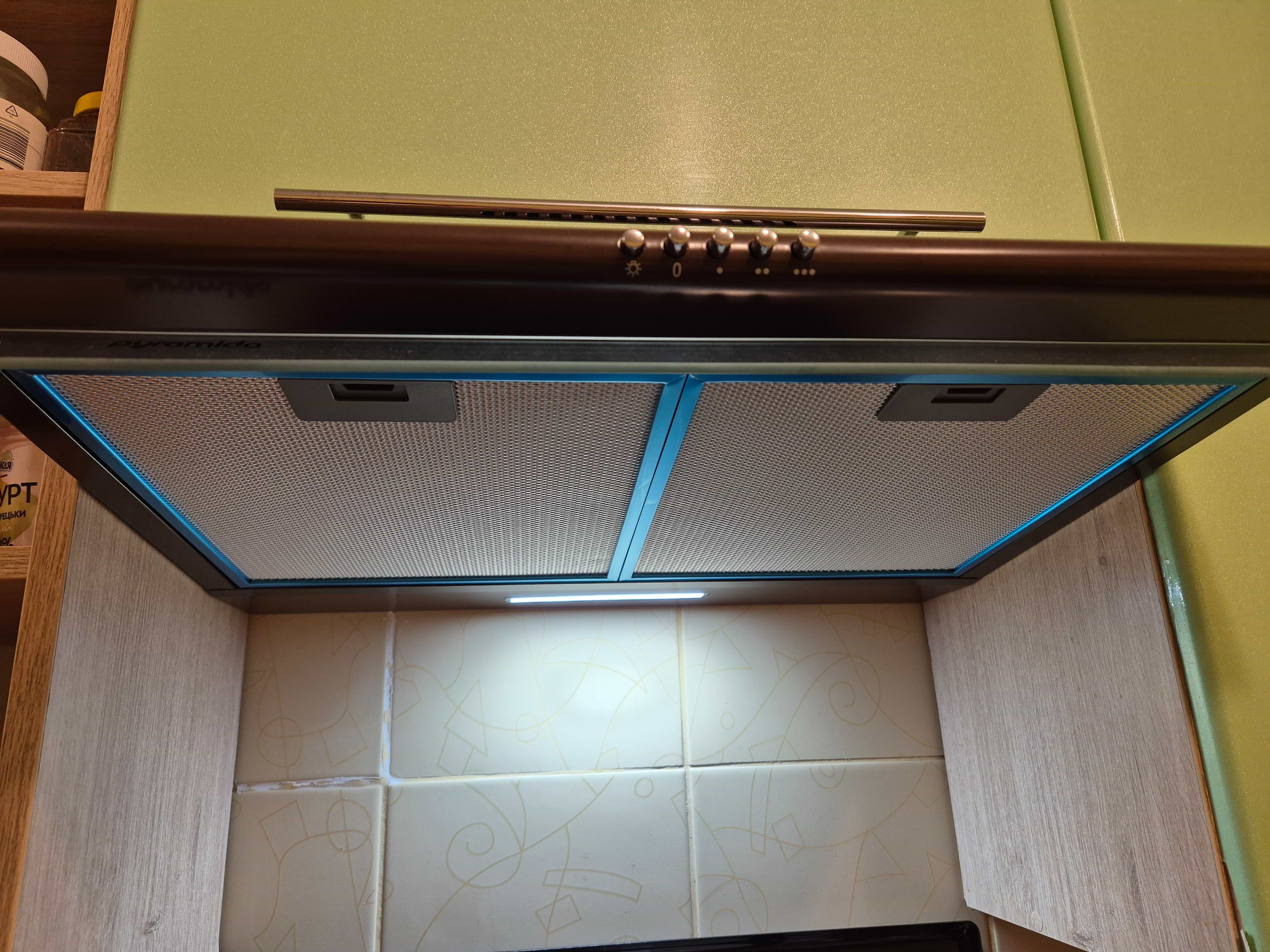 Купили витяжку за рекомендацією консультанта магазину. Замовленням задоволені, швидка доставка. Працює відносно тихо, світло добре, на фото видно. Має 3 швидкості для роботи, кожен вмикається та вимикається кнопкою. Легко розбирається для чистки