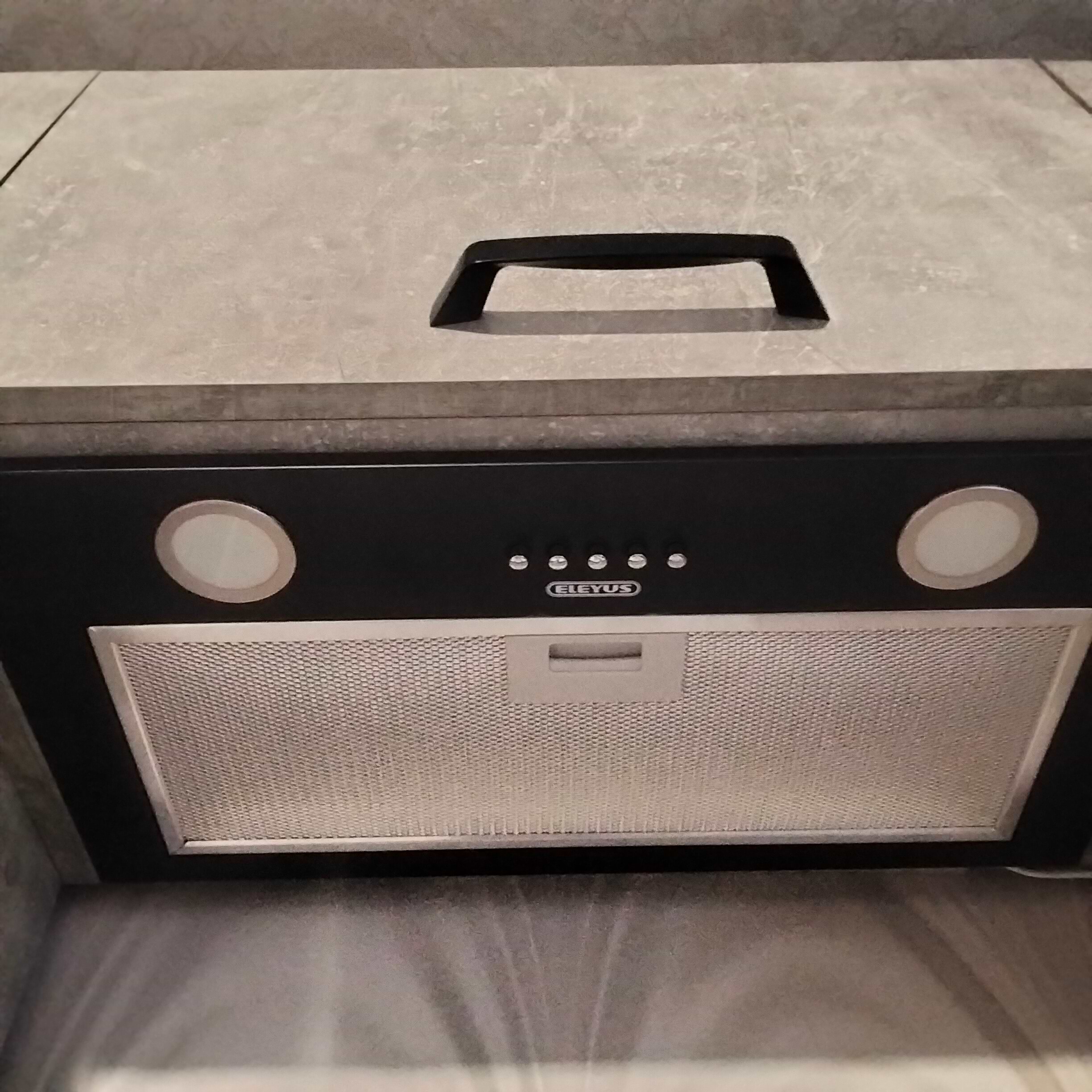 Витяжка ELEYUS INTO 700 52 WH. Вытяжка встроенная, очень компактная, её почти не видно. За счёт этого , она прекрасно вписывается в дизайн кухни. Имеет 3-и скорости и подсветку. При желании можно заменить лампочки на более яркие и тогда она хорошо освещает кухню. При готовке даже дополнительный свет не нужен.