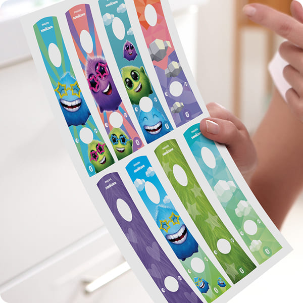 Интересные наклейки на ручку позволяют детям выбрать внешний вид зубной щётки.