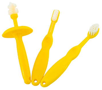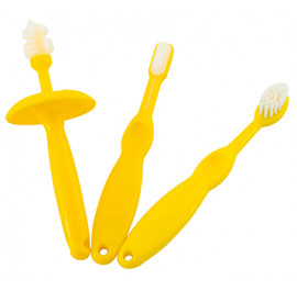 Купила по рекомендации врача, набор из трех щеток для разного периода. Сейчас пользуемся силиконовой, так как зубки только начинают резаться и щеточка помогает чесать десна, ограничитель обязательно использую, что б не проник глубоко в горлышко. Вторая щетка будет уже для первых зубов, а третья стандартная щеточка с мягкой щетиной. Набор полезный для родителей и безопасный для ребенка, это самое главное.